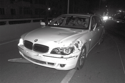 记者在现场看到,桥上正在施工施划街路导向字标,一辆牌号为黑AWS018号白色宝马轿车停在路中,该车左前部受损,前车牌被撞掉。