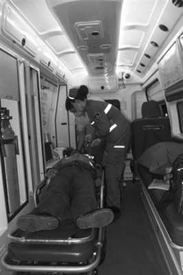 接到线索后,记者第一时间赶到事发现场,急救人员正将伤者抬到急救车上救治,地面上躺着的一名工人经120急救人员确认已经死亡,随后急救车驶离现场将伤者送至省医院救治。