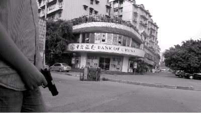 8月10日,重庆沙坪坝区凤鸣山康居苑中国银行储蓄所门前,一个居民拿着玩具枪在枪击案现场。嫌犯得手后,沿凤天路往西南方向逃跑。图/记者刘有志