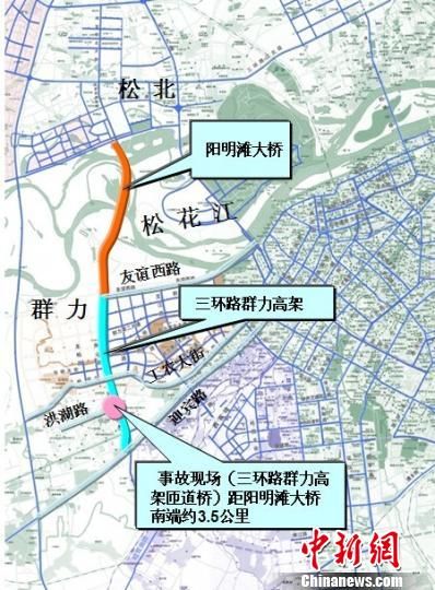 哈尔滨塌桥事故的平面示意图。从示意图可以看出,事故地点是三环路高架桥进入群力高架主桥的一小段匝桥,而非阳明滩跨江桥。哈尔滨市建委提供 摄