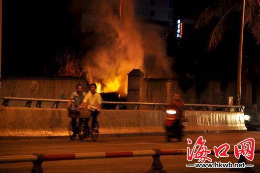 昨晚8点,在海甸岛和平路边附近,有市民随意放火焚烧垃圾,黑色的烟雾熏满夜空,臭气直呛路过的市民,简直是太不文明也太危险了,万一火势过大,那后果就不堪设想了,幸运的是一个小时后火自然灭了。