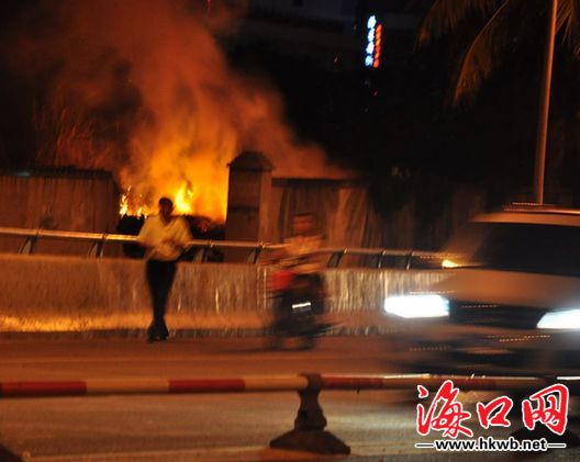 昨晚8点,在海甸岛和平路边附近,有市民随意放火焚烧垃圾,黑色的烟雾熏满夜空,臭气直呛路过的市民,简直是太不文明也太危险了,万一火势过大,那后果就不堪设想了,幸运的是一个小时后火自然灭了。