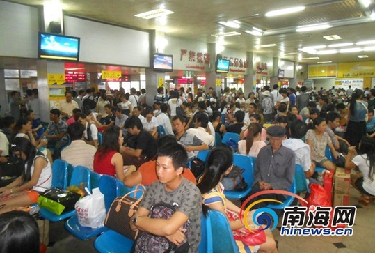 中秋前夕三亚各大车站迎客流潮,旅客在候车室等待发车。