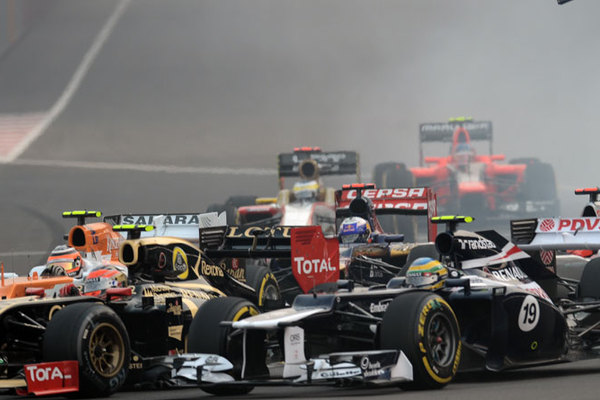 当地时间10月28日,世界一级方程式大奖赛印度站比赛发车阶段,赛车纷纷进入第一个弯道,其间,数辆赛车发生剐蹭,车身碎片在赛道上“飞溅”。