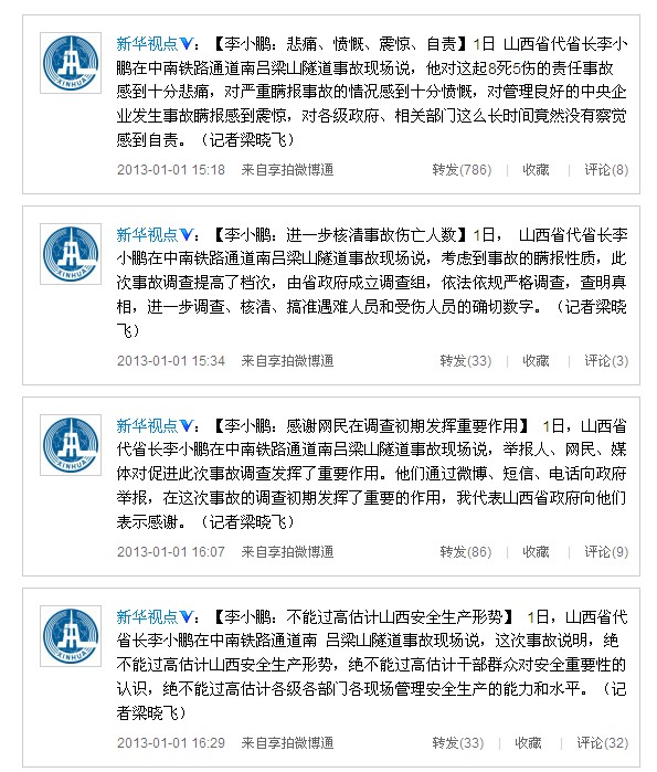 【李小鹏:感谢网民在调查初期发挥重要作用】 1日,山西省代省长李小鹏在中南铁路通道南吕梁山隧道事故现场说,举报人、网民、媒体对促进此次事故调查发挥了重要作用。他们通过微博、短信、电话向政府举报,在这次事故的调查初期发挥了重要的作用,我代表山西省政府向他们表示感谢。(记者梁晓飞)