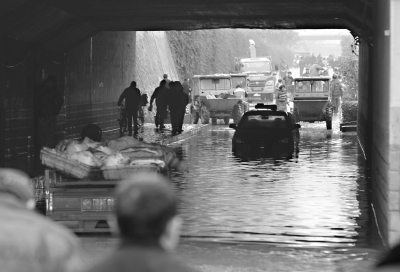 昨日8时许,施救人员正设法拖出浸泡在水中的出租车 (长江日报 记者刘斌 摄 )