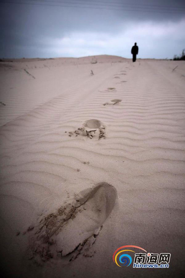 韩群畴从父亲手中接过守灯的“接力棒”后,至今坚守了11年。图为韩群畴从村里到单标点途经沙丘地带。 (南海网记者 张茂 摄)
