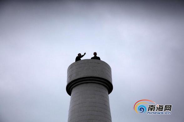 韩群畴爬上航标塔。 (南海网记者张茂摄)