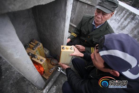 韩发光父子在为航标灯换电池。(南海网记者 张茂 摄)