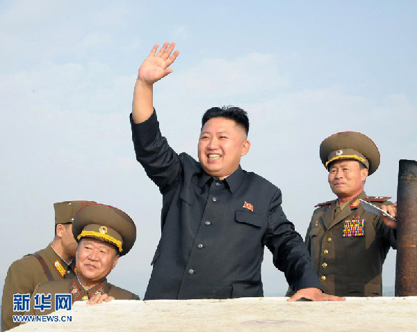 这张朝中社2012年8月19日提供的照片是朝鲜最高领导人、朝鲜人民军最高司令官金正恩视察朝鲜西南前线最南端的岛屿防御队。