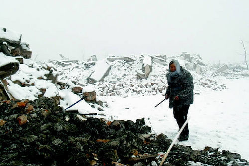 瑟瑟的寒风中,传来叮叮当当的响声,那是敲打钢筋的声音。废墟中,零星散落着忙碌的身影,他们是外村来干活的农民。其中一人放下手中的活告诉记者,他每天的工钱是80元,主要是将这些废墟中的钢材敲出来当废品卖,一栋房子卖废品可卖到七八百元。