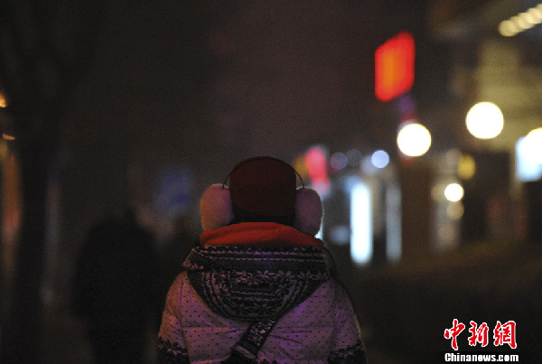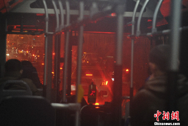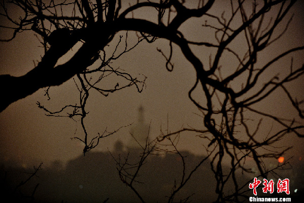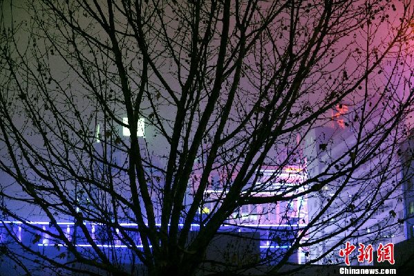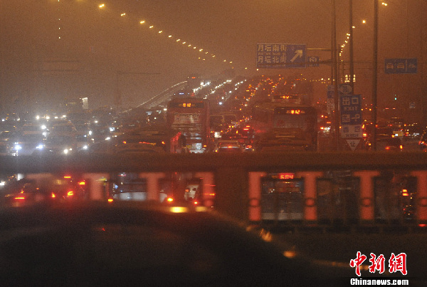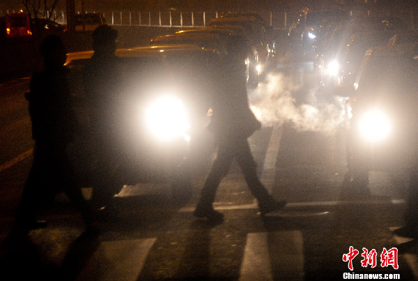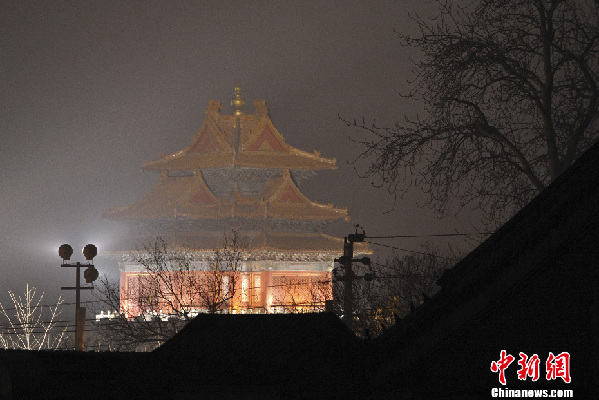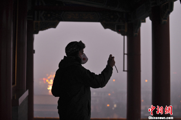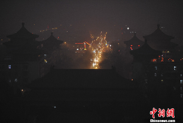 1月30日,严重雾霾依然笼罩着北京,夜色中的空气质量仍为严重污染。