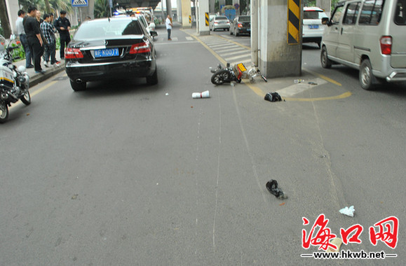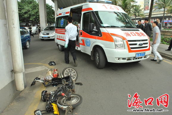 海口网2月1日消息(见习记者 傅紫堃 摄影报道)上午11时20分,南大桥龙昆北路与华海路交界处发生电动摩托车轿车相撞事故,一辆往龙昆南方向、陕西牌照的奔驰260轿车与从华海路开出的电动摩托车相撞。初步确定伤者无生命危险,目前已送往医院救治。