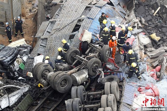 2月1日上午9点,连霍高速渑池段服务区附近一辆载满烟花爆竹的货车发生爆炸,引起桥面断裂。坍塌桥梁长度约80米,从桥上掉下6辆车,死亡5人,伤8人。图为事故现场。中新社发王中举 摄