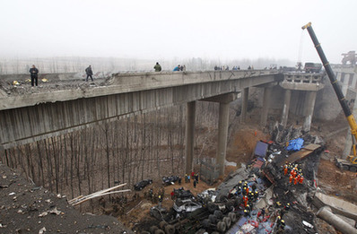 2月1日上午9点,连霍高速渑池段服务区附近一辆载满烟花爆竹的货车发生爆炸,引起桥面断裂。坍塌桥梁长度约80米,从桥上掉下6辆车,死亡5人,伤8人。图为事故现场。中新社发王中举 摄