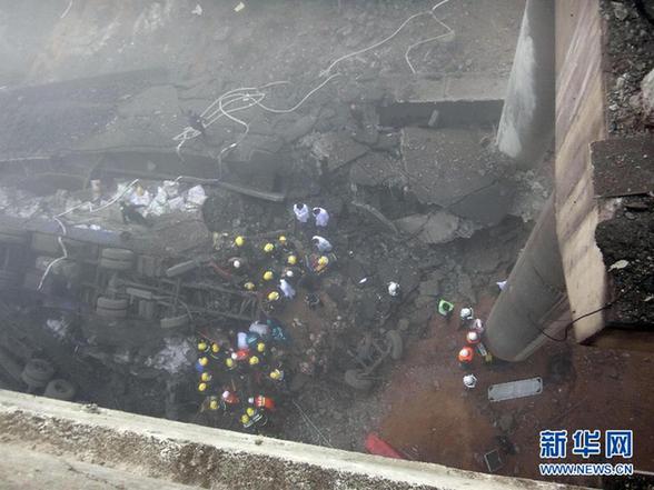 2月1日拍摄的事故救援现场。据初步了解到的情况,当天上午8时52分,连霍高速公路K741+900公里处发生桥面坍塌事故,造成连霍高速南半幅阻断。现场反馈情况疑为运输烟花爆竹车辆发生爆炸,造成桥面坍塌,导致多辆行车坠桥。新华社发(肖孟摄)