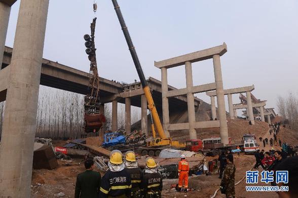 这是2月1日拍摄的事故救援现场。记者2月1日17时从河南省三门峡市获悉,当天上午发生爆炸坍塌的连霍高速义昌大桥事故。这次事故发生在当天上午8时52分,位置在连霍高速公路K741+900公里处。疑为运输烟花爆竹车辆发生爆炸,造成连霍高速义昌大桥南半幅桥面坍塌,北半幅桥板松动,连霍高速双向断行。被炸坍的桥梁高度30米,共被炸坍2个桥洞,长度达80多米。目前,消防官兵已经从现场清理出9辆大货车,坍塌物下面还压有多辆小轿车,具体数字不清楚。但他们估计,至少有25辆车坠桥。新华社记者赵鹏 摄