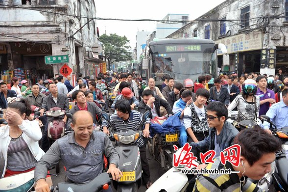 海口网2月3日消息(记者 李汉仁)2月2日下午2时许,海口博爱南路出现严重堵车。2时40分左右,记者来到博爱南路口,看见车辆、人流己堵“死”。据了解,春节临近,大家都来这里买年货,所以每天都出现严重堵车现象。