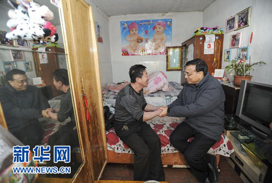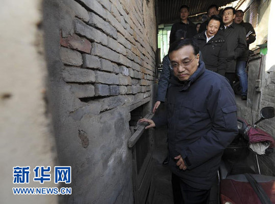 2月3日下午,李克强看望包头北梁棚户区居民,这里小巷窄到两人见面要侧身过,900多人才有一个厕所,三代同堂十几平米。这是李克强来到高俊平家看望。 新华社记者 谢环驰 摄