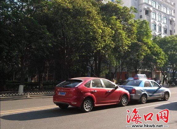 今天下午4点30分,海口市国贸路往玉沙路方向发生一起小车追尾事故。记者赶到现场看到一辆红色的福特轿车撞在了一辆出租车的尾部,所幸没有人员伤亡。