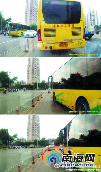 “绿灯亮后,原本在临近车道行驶的一辆30路公交车突然插到我的车前面,我赶紧躲闪,车辆擦到护栏后,匆忙停车。”黄先生说,其中任他如何鸣笛均不起作用。他当即将视频上传微博,称:“琼A28299的30路公交车不按导向车道行驶,强行越线插队,行为恶劣,请依法予以处理”。