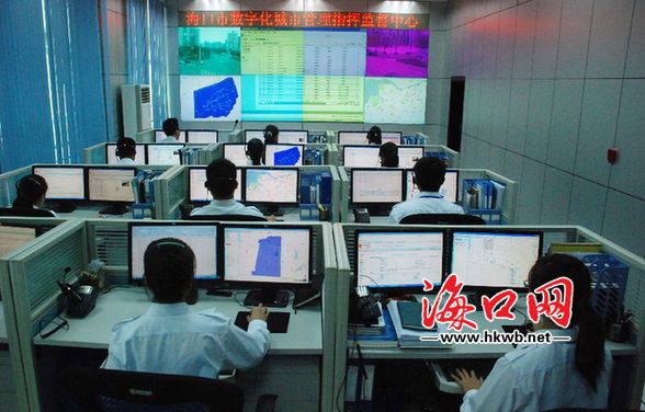 海口城市数字化管理中心的工作人员坚守岗位。见习记者朱佳莹 摄