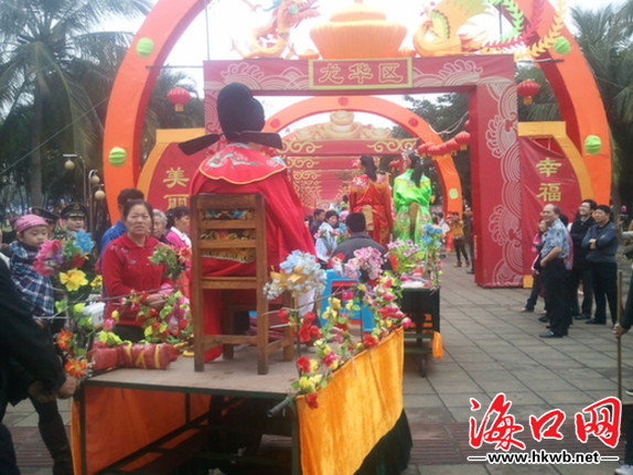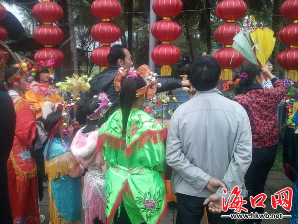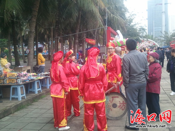 “龙狮贺春献吉祥”舞龙舞狮、公仔戏、花车游行等民俗表演精彩纷呈。上午10点,一支由十几名孩子组成的巡游队伍沿着园内的大道缓缓前行。“冼夫人、送子观音、陈香救母......”各路仙人及各位古代名人的扮相引得市民围观拍照。“太有意思了,让小孩扮演古代名人,这在我们老家可没见过。海南的公仔戏别具一格,也很吸引我。”第一次在海口过新年的游客林女士说,园内的民俗表演让她长了不少见识。公仔戏的表演者在幕后一边操纵做工精致的公仔一边配合海南的传统乐曲唱述故事令她大开眼界。