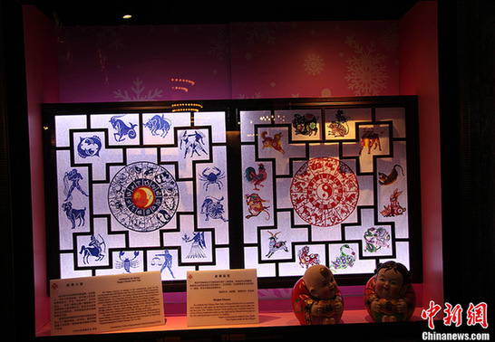 美国纽约著名地标性建筑帝国大厦推出新春橱窗展,庆祝中国农历春节。该橱窗主要用中国剪纸布置。中国家庭过年时都喜欢在窗户上贴窗花,该窗花图形包含中国传统的十二生肖外及西方十二星座,巧妙展现中国剪纸在中西文化创意的灵感。所有的剪纸皆由中国河北蔚县民间艺人手工制作而成。中新社发阮煜琳 摄