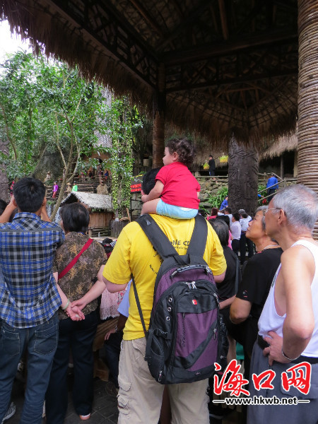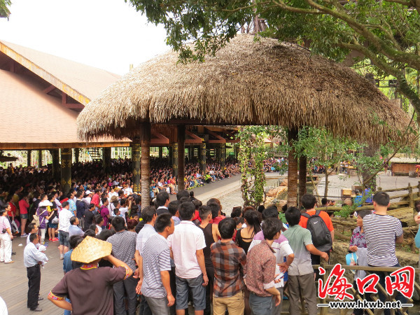 在槟榔谷各大旅游板块则随处可见来自全国各地的游客,扶老携幼、人潮涌动。颇受游客喜爱的《槟榔古韵》大型原生态黎苗文化实景演出观演区更是人山人海,欢声雷动。台上的黎苗族青年男女生动展现了本民族的生活常态,用捏耳朵表现爱意的细节让游客欢笑不断。