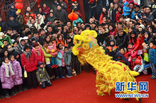 2月10日,在新春文化庙会上,舞狮演员与观众互动。当日是农历大年初一,郑州市2013年新春文化庙会在市内的城隍庙开幕。庙会上集中展示了具有中原地区特色的民间艺术和民俗文化,吸引了大批市民和游人前来观赏和体验。新华社记者王颂摄
