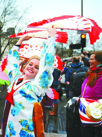 伦敦华埠商会2月10日在英国伦敦市中心举行一年一度新春庆典,庆祝中国农历新年。数万名中外游客在细雨中观看了庆典及演出,共度新春。新华社发