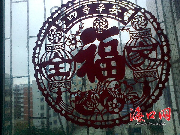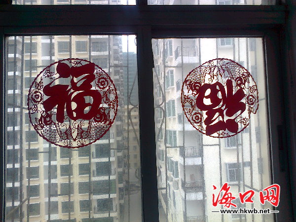为了让年更接近自己,她和家乡的人一样,到商场置购年货,像瓜子、花生、对联、窗花、蜡烛、鲜花、肉、蔬菜等,都是少不了的。尤其是窗花,记得每年在家过年,都是她和家人一起贴窗花的,其中“福”字最多,还有童子送金鱼、喜鹊戏冬梅、福寿连年等等,那种感觉真是温馨无比。然而,今年,她只好一个人贴窗花了。不过,看到喜庆的窗花,大大的“福”字,这个皖西北的姑娘也能感到年就在她的身边,思乡之情也渐渐淡去。