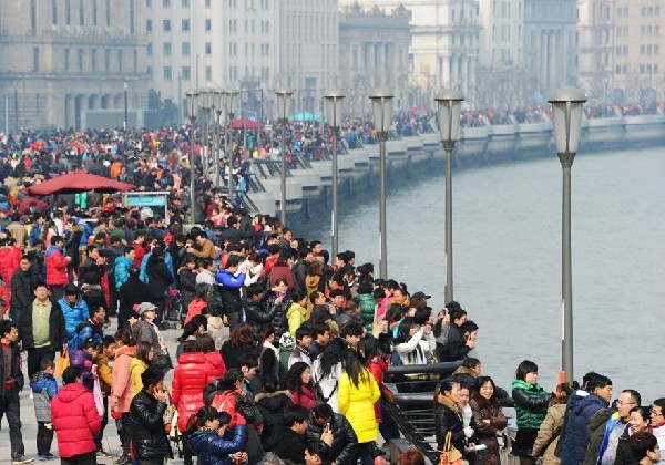 2月10日,上海,农历蛇年新春,晴好天气使外沪上的各处旅游景点都呈现火爆的人气。外滩观光平台上游人如织,就连浦江的轮渡船上也挤满了乘客。