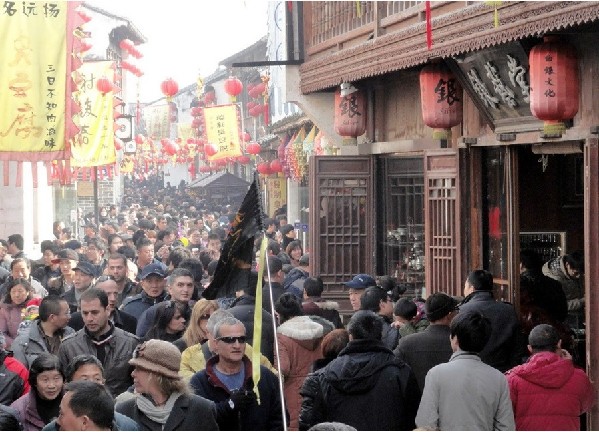 2月10日是农历大年初一,古城苏州,颇具浓郁江南水乡韵味的苏州市山塘古街上热闹非凡,游人如织,呈现出一片喜庆的节日气氛。图为苏州山塘古街上人头攒动。