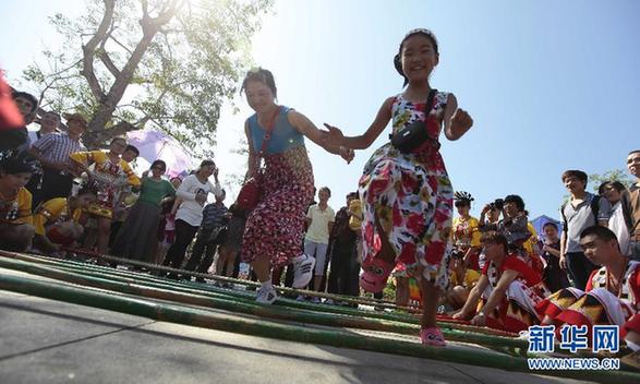 2月11日,大年初二,游客在海南省三亚市南山佛教文化苑跳竹竿舞。春节,不仅是人们团圆欢聚的日子,也是人们外出旅游的好时候。蛇年春节长假,我国各地景区迎来众多观光休闲的游客,人潮涌动。新华社发(陈文武摄)