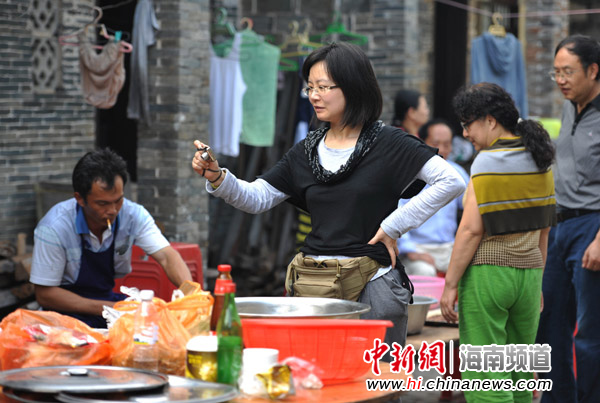 游人在琼海市嘉积镇乡村观看村民日常生活。