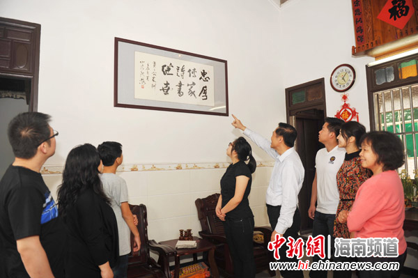 琼海市嘉积镇大园村民向来宾介绍自家的祖训牌匾含义。