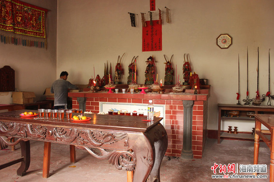 大年初四,海南省万宁市万城镇裕光居委会吴排村喜迎祥龙拜新年,祈福2013年风调雨顺、吉祥平安。图为村庙里的掌事早早摆酒、点烛、烧香静待祥龙。叶霖嘉摄
