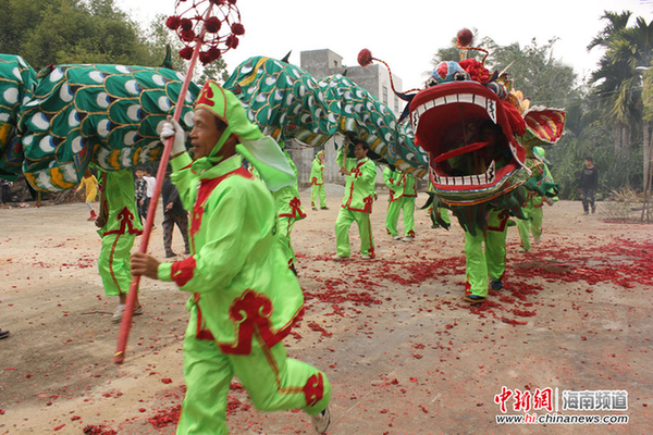 大年初四,海南省万宁市万城镇裕光居委会吴排村喜迎祥龙拜新年,祈福2013年风调雨顺、吉祥平安。图为祥龙游村。叶霖嘉摄