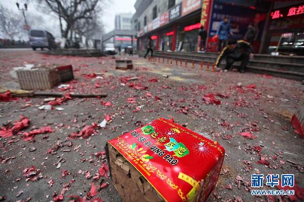 2月14日,江苏南通一家商铺的店主在燃放“开门炮”。当日是大年初五,我国民间有初五迎财神的习俗,一些商家也会选择这一天燃放“开门炮”迎财神,重新开业。“开门炮”鞭炮齐鸣的同时,也加重了空气污染。 新华社发(徐培钦摄)