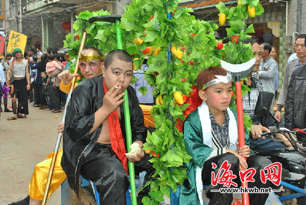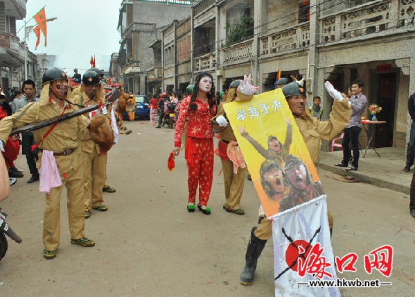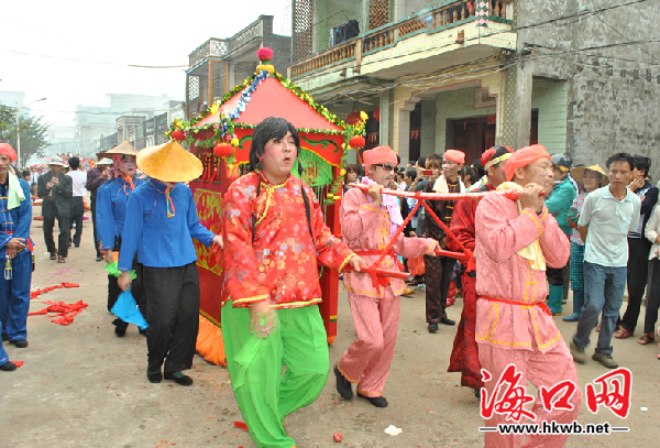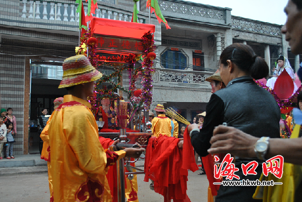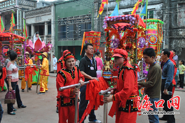 海口网2月15日消息(见习记者 傅紫堃)大年初六,临高县的渔业大镇新盈举办祭公游行,各种神话人物粉墨登场,所到之处锣鼓喧天喜气洋洋,居民们纷纷在家门口置下清酒果品,迎神祈福。