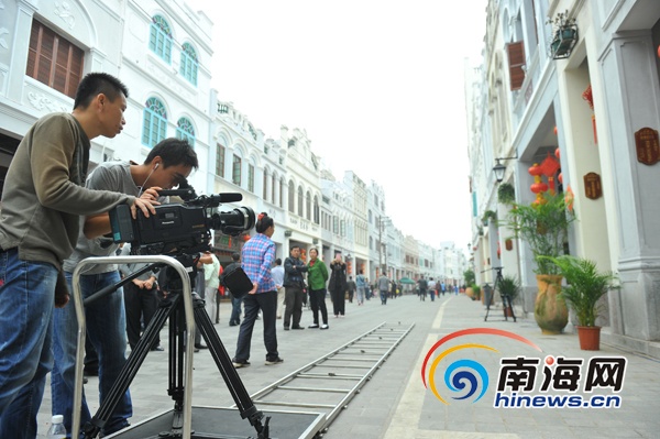 大年初六,中央电视台在海口中山路等骑楼老街拍摄。(南海网记者秦彦摄)