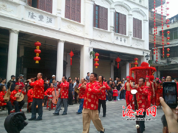 海口网2月15日消息 (见习记者 胡晓航) 唢呐齐鸣、锣鼓阵阵,一支由数十人组成的“迎亲”表演队伍合着喜气洋洋的民乐步入中山路的海口骑楼老街。2月15日下午3时,海口骑楼老街的年俗活动——“迎亲”正在上演,为市民游客展现本地传统的嫁娶民俗文化,于修缮一新的老街内重现海南人民的过往生活。