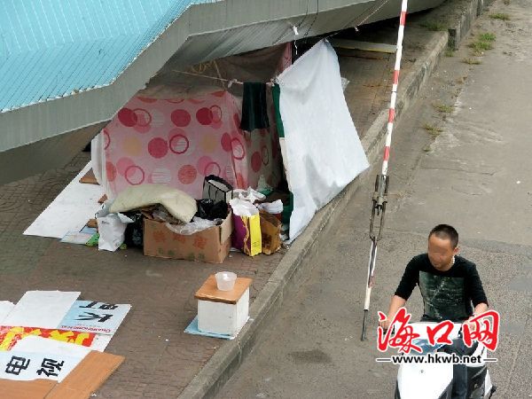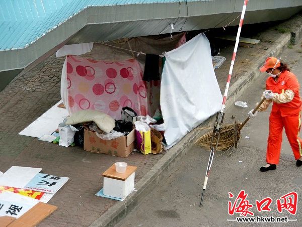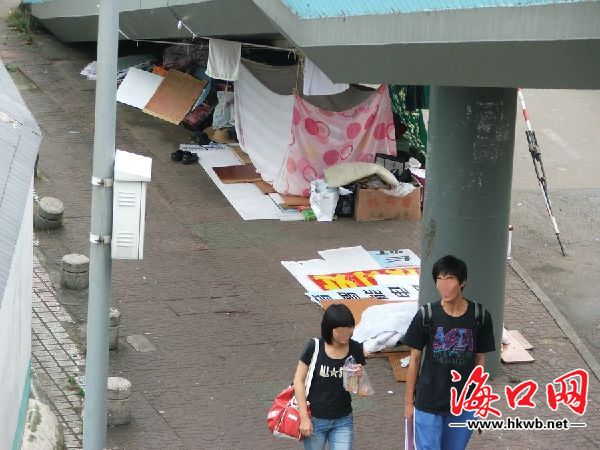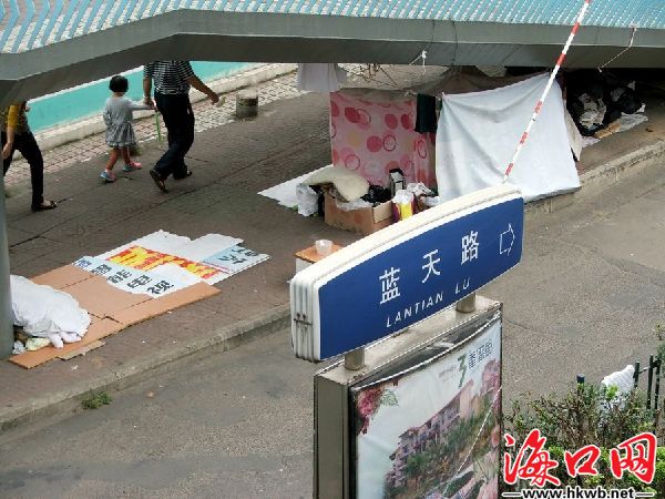 在海口市蓝天路彩虹天桥下,部分民工在桥下乱搭纹帐,存放衣服丶纸箱等杂物.与周围环境很不协调,很不雅观!希望有关部门能整治一下这种不文明现象。