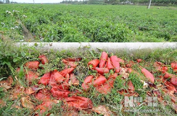 2月20日,在海南琼海市潭门镇社昌村的农田旁,部分红泡椒被菜农扔在了道路旁。
