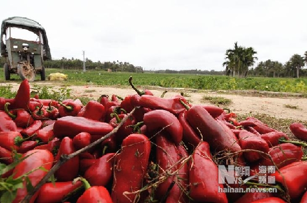 2月20日,在海南琼海市潭门镇社昌村,部分红泡椒被菜农扔在了农田里。