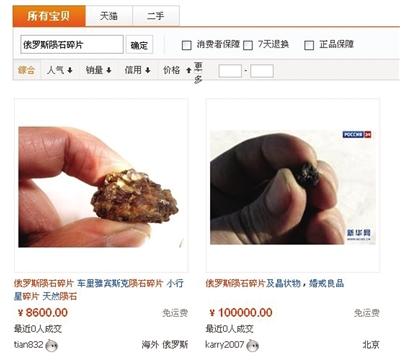前日,记者在淘宝网上搜索“俄罗斯陨石碎片”关键字,可搜到多条销售自称此次事件中的“陨石碎片”的信息。