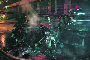 接到119指挥中心报警后,五里店消防中队迅速出动一辆消防车赶往事故现场。消防员到达现场时,一辆宝马750i型轿车停在路边,正冒出熊熊火焰,路边不少人正在围观。而在几十米外,还有人正在燃放烟花。由于现场位于路边,沿街都是饭店,为保护过往车辆及行人的安全,消防队员立即做好应急处置准备。仅用了两分钟,消防员就成功将火扑灭,道路也随之恢复正常。消防队员了解到,宝马车是被周围燃放的烟花引燃。此时,宝马车的车头被烧烂,已经报废。宝马车主闻讯从路边的饭店中出来查看情况,看到自己的车成了这个样子,一时无语。