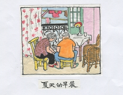 饶平如喜欢丰子恺和叶浅予的画,经常买来学。从妻子去世之后,他开始作画,一方面怀念亡妻,一方面也是给子孙留下记录。孙女饶青欣介绍,他上午打拳,下午喝杯咖啡后,先构思,然后提笔画画。一幅小画,大概需要两个小时。