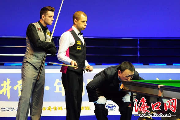 塞尔比和霍金斯与裁判一起瞄球线路。记者 张俊其 摄